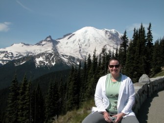 nSally Kuhn Sennert of the Global Volcanism Program in front of Mt. Rainier, Washington.