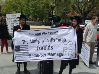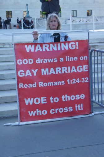 Sitting cheek-by-jowl in the packed press gallery at the Supreme Court on Tuesday and listening to 150 minutes of oral arguments in the historic same-sex marriage cases, I marveled at how radically the defense of “traditional marriage” has shifted in just a few short years. There was a motley crew of devout bible wranglers on the courthouse steps preaching fire and brimstone (see a couple of shots I snapped, below), and one brave soul who stood up in the courtroom yelling at the top of his lungs that the justices will “burn in Hell” if they approve the “abomination” of a right to same-sex marriage. He was quickly removed from the courtroom, but continued to make himself heard from the outside for a good 10 minutes while Solicitor General of the United States Donald Verrilli made a soaring case for treating gays and lesbians equally under the Constitution.
