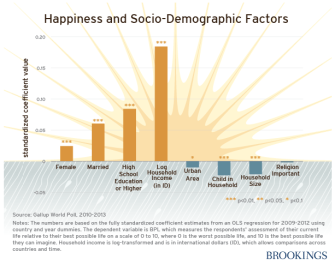 Ever heard the claim that above a basic level of economic well-being, richer people are no happier than the rest of us? It might not be true. Ms. Graham’s findings show that household income can boost your happiness level even more than being married, being female or being reasonably well educated. “After basic needs are met,” she writes, “other things like how your income compares to that of your peers also start to matter.” Rousseau may have been right when he associated the rise of civilization with the tendency of people to compare themselves with one another, and the jealousy and struggles for power that ensue.