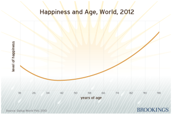 Here is the biggest surprise of Ms. Graham’s research. Youth may really be wasted on the young. They’re healthy, robust and full of potential, but young ones aren’t so happy, overall. (Maybe, in part, because they’re more likely to be unemployed?) And their happiness level falls steadily for a while: the 20s and 30s are downer decades, apparently. But wait for your early 40s and things will begin to look up considerably. As long as you have your health, each decade starting at the age of 42 will, more likely than not, be better than the last. If there is something odd about the U-shape of this graph, it’s the indefatigably upward slope of the curve even into the 80s and 90s. A 98-year-old is probably about twice as happy as he was 80 years earlier: