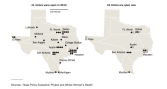 Fast-forward 21 years to 2013, when Texas passed House Bill 2. By establishing upgrade requirements and a new rule that physicians performing abortions must have admitting privileges at a local hospital, the law shuttered many of Texas’s abortion facilities, leaving “fewer than a dozen clinics across its more than 267,000 square miles.” For women in El Paso or other western parts of the state, this meant an abortion was more than a 500-mile drive away. Here is how The New York Times depicted the change: