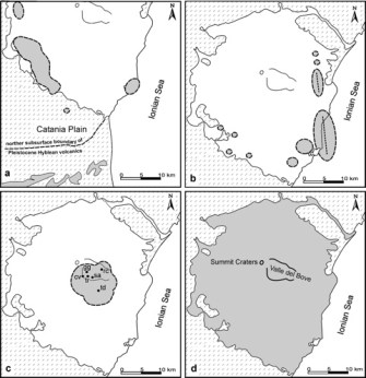 nDistribution of eruptive products of the four main phases of volcanism in the Etna area: (a) Basal Tholeiites; (b) Timpe phase; (c) Valle del Bove eruptive centers; (d) Stratovolcano phase. From Branca et al. (2004)