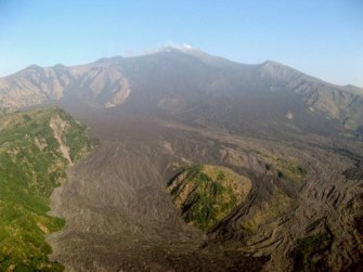 nAerial view of the Valle del Bove, a huge collapse depression formed by a massive sector collapse of Etna’s eastern flank about 9000 years ago. Much of the depression has been filled by more recent lava flows; the original depth must have been significantly greater. This view is from the southeast, showing the summit craters in the upper center. Photo taken in August 2007 by Boris Behncke