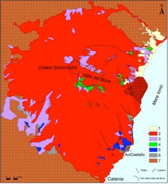 nGeological map of Mount Etna, from the INGV-Catania web site (courtesy of Stefano Branca). Key: (1) Recent alluvial deposits; (2) Mongibello (past 15,000 years) eruptive products (2a) “Chiancone” volcaniclastic debris deposit; (3) Ellittico eruptive products; (4) Valle del Bove centers eruptive products; (5) Timpe phase eruptive products; (6) Basal Tholeiites; (7) Sedimentary basement; “Faglia” = fault, “Orlo della Valle del Bove” = Valle del Bove rim; “Crateri Sommitali” = Summit craters