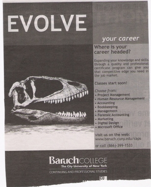 Recently spotted this ad from Baruch College in the New York Post. The headline and picture make a compelling argument: EVOLVE your career (or you’re a dinosaur).