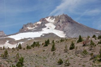 Mt. Hood taken near Timberline Lodge showing Crater Rock in the avalanche scar. Taken by Erik Klemetti in August 2008.