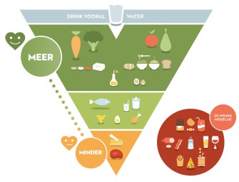 Belgium’s food pyramid. The top says ‘Drink mostly water’. The green circle says ‘more’ and the yellow circle says ‘less’. The red section says ‘as little as possible’ and is for foods that are “not necessary for a balanced diet and can even damage your health.”