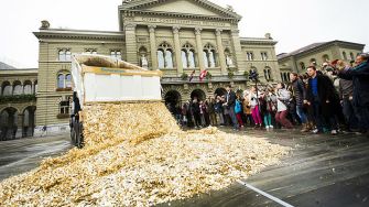 A rally in favor of the defeated Swiss referendum; there are eight million coins here, one for each Swiss citizen.