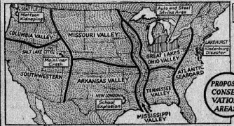 The Columbia Valley, Southwestern, Arkansas Valley, Missouri Valley, Mississippi Valley, Great Lakes – Ohio Valley, Tennessee Valley and Atlantic Seaboard were areas apparently marked out for conservation. Some events are marked on the map: