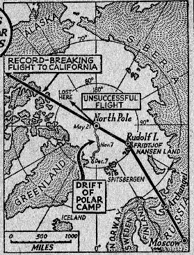 1937 was a year of polar firsts – mainly for the Soviets, a development surely watched with apprehension by the US. There was the amazing July flight of Sergei Danilin, Mikhail Gromov and A.B. Yumashev from Moscow to San Jacinto via the North Pole. The non-stop flight covered an record-breaking 10.148 km (6.303 miles), so amazing that some sources later wondered whether the flight wasn’t a carefully constructed hoax. It wasn’t the only transpolar flight of the year, though: another Soviet crew made it to Vancouver Island, indicating that transpolar aviation was quite the thing to do in 1937. The Soviets were very busy in the High North (as they are again now), since the drifting polar camp indicated on the map must be the one of Soviet explorer Otto Schmidt.