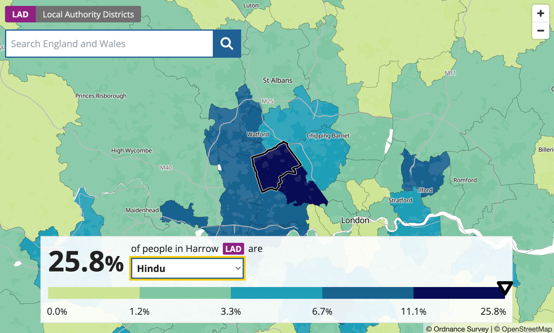 - The third was “Hindu” (5.1%, up from 5%). Harrow, in Northwest London, has the highest share of Hindus in England and Wales (25.8%, up from 25.3%).