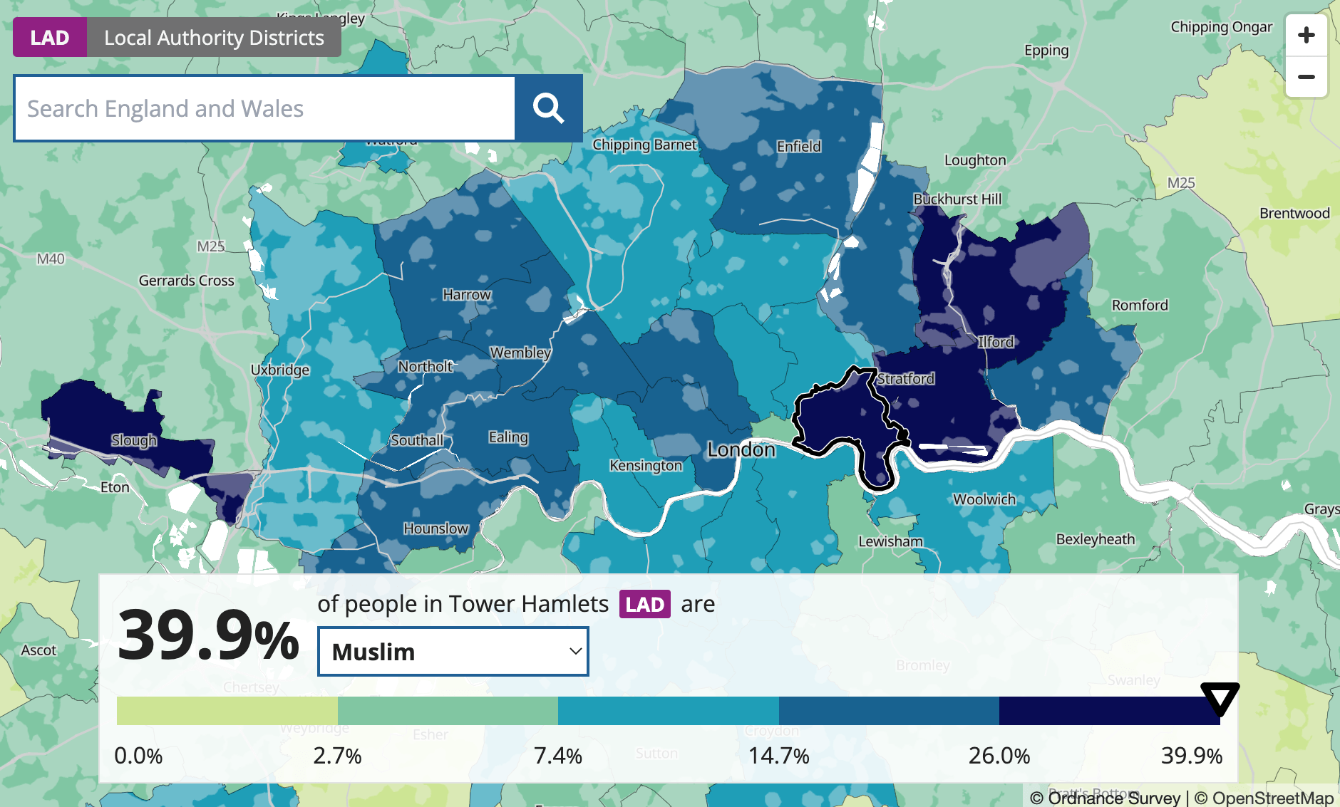 - The second most popular response in London was “Muslim” (15%, up from 12.6% in 2011). Tower Hamlets, in East London, had the highest reported share of Muslims in either England or Wales (39.9%, up from 38%).