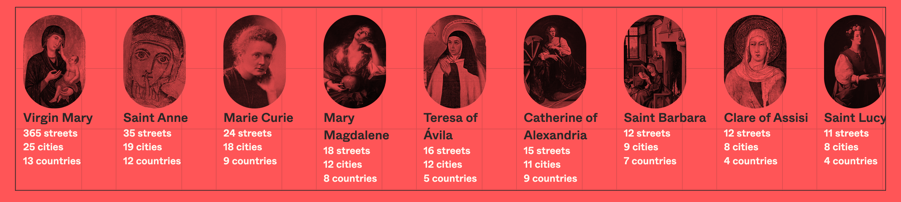 Marie Curie (24), the third most popular woman on street signs, is the odd one out for being a scientist. The rest of the female top 10 is entirely religious: Mary Magdalene (18), Teresa of Avila (16), Catherine of Alexandria (15), Saint Barbara (12), Clare of Assisi (12), Saint Lucy (11), and Martha (11).