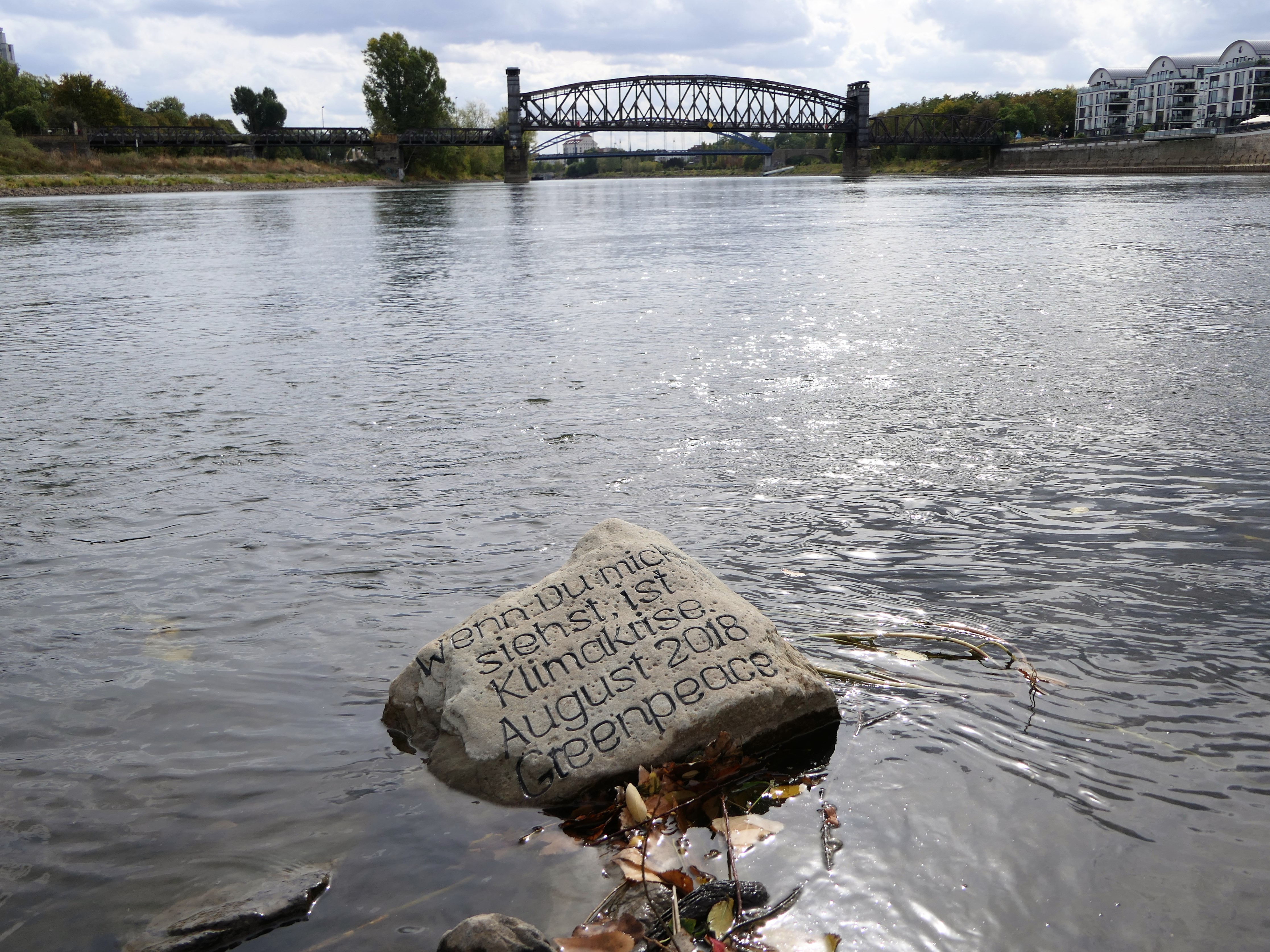 - A stone in the Elbe near Magdeburg has a more contemporary message: Wenn du mich siehst, ist Klimakrise. August 2018 Greenpeace. — “When you see me, the climate is in crisis.”