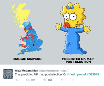 On polling day, he noticed a striking resemblance between a map of the predicted electoral outcome and Homer and Marge Simpson’s youngest… Maggie. Could that have been a sign from that other Maggie, calling in from the Great Beyond?