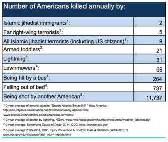 “…successfully highlighted the huge disparity between (i) the number of Americans killed each year (on average) by ‘immigrant Islamic Jihadist terrorists’ and (ii) the far higher average annual death tolls among those ‘struck by lightning’, killed by ‘lawnmowers’, and in particular ‘shot by other Americans’.”